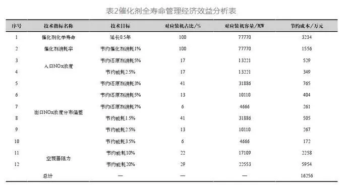全壽命管理模式實施后,能夠提升脫硝裝置運行穩(wěn)定性與可靠性,進而可以有效的控制火電機組NOx排放量。另外通過延長催化劑的實際使用壽命可減少催化劑的更換量,進而可減少廢棄催化劑的處置量,因此具有良好的環(huán)保效益。