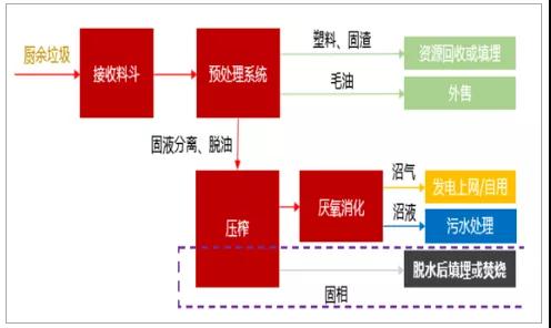 餐廚垃圾的特點(diǎn)包括有機(jī)物含量高,含水率高,易腐爛變質(zhì),易發(fā)酵、發(fā)臭,主要是采用厭氧消化、好氧堆肥和飼料化工藝等生物法進(jìn)行處理。其中厭氧消化工藝能最大化回收油脂,無害化程度高,并能夠充分地對餐廚垃圾中的有機(jī)物進(jìn)行資源化回收和利用,已經(jīng)有超過70%的餐廚垃圾處理項目使用這條技術(shù)路線,是現(xiàn)階段的主流工藝路線。