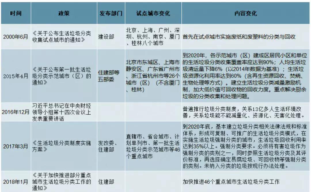 垃圾分類政策開啟廚余垃圾處理市場。2000年,北京、上海等8個城市被列為生活垃圾分類試點(diǎn)城市;2015年,26個城市(區(qū))被列為“全國第一批生活垃圾分類示范城市(區(qū))”;2017年,發(fā)改委住建部發(fā)布《生活垃圾分類制度實(shí)施方案》,要求在全國46個城市先行實(shí)施生活垃圾強(qiáng)制分類;2019年,《關(guān)于在全國地級及以上城市全面開展生活垃圾分類工作的通知》明確提出“有害垃圾、干垃圾、濕垃圾和可回收物”的生活垃圾4分類法則,并將分類范圍從原先的46個試點(diǎn)城市推廣至293個地級城市。目標(biāo)明確為,到2025年全國地級及以上城市基本建成生活垃圾分類處理系統(tǒng)。而2017年293個地級及以上城市垃圾清運(yùn)量為1.76億噸,是之前46個試點(diǎn)城市垃圾清運(yùn)量的1.85倍。