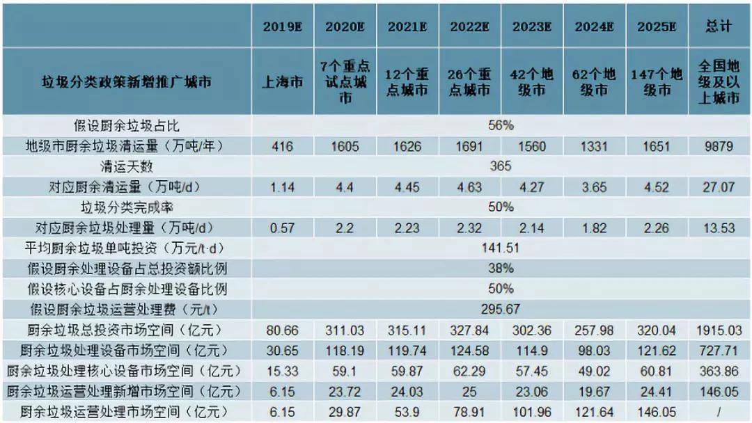 以100個餐廚垃圾試點(diǎn)城市的平均餐廚垃圾項目單噸投資額76.6萬元/t,處理費(fèi)197元/t作為合理估計值,可得上海環(huán)境松江、上海環(huán)境嘉定、海峽環(huán)保福州、首創(chuàng)環(huán)保寧波(一期)4個項目的平均廚余垃圾單噸投資額為141.5(萬元/t)??紤]到廚余垃圾的綜合處理費(fèi)較高,假設(shè)廚余垃圾處理費(fèi)是餐廚垃圾的1.5倍為295.7(元//t•d),以地級及以上城市平均每天產(chǎn)生約27萬噸廚余垃圾測算,在中性情景下(即垃圾分類完成率為50%),廚余垃圾總投資額市場空間為1915億;按廚余垃圾處理設(shè)備占總投資額的38%,核心設(shè)備占廚余處理設(shè)備的50%計算,對應(yīng)市場空間為364億;2025年廚余垃圾運(yùn)營處理市場的空間預(yù)計可達(dá)146億元,市場空間廣闊。
